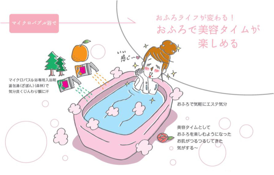 マイクロバブルアダプターから噴射される気泡は、20マイクロメートルという細かさ。浴槽内にお湯の流れを生み出し、いつも温かいお湯でお肌を包み込みます。マイクロバブルはお肌や産毛に付着し、お肌がさすり上げられるような心地よい感覚を感じられます。マイクロバブル浴には、「リラックス効果」「温浴効果」「肌のうるおい効果」を期待することができます。