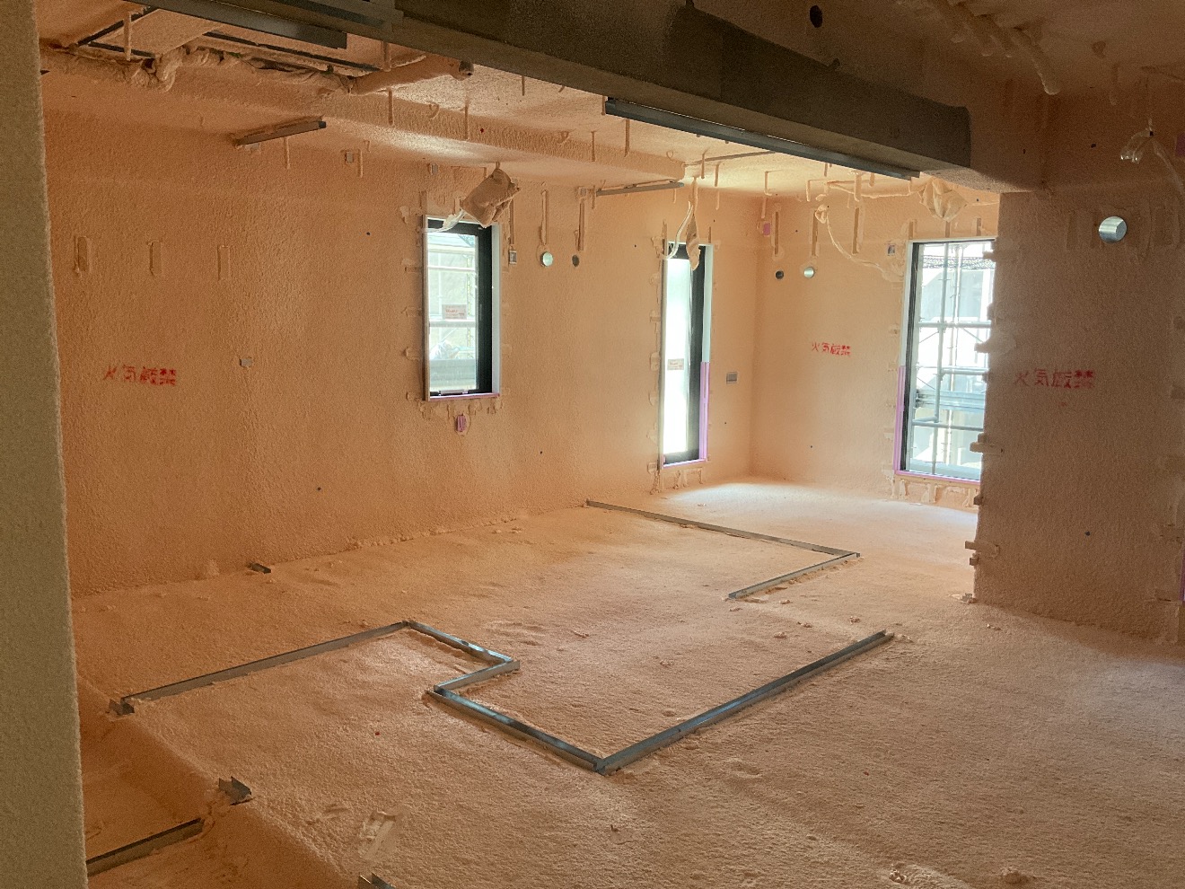 断熱材は吹付硬質ウレタンフォームとしていますが、一般的な「屋根面」と「外壁面」に加え、住戸内の「床面」と「天井面」にも施工することで断熱性能を高めています。このことで室内熱環境を向上することができ、省エネ効果もあります。また、「設計住宅性能評価の断熱等性能等級3」も所得しています。