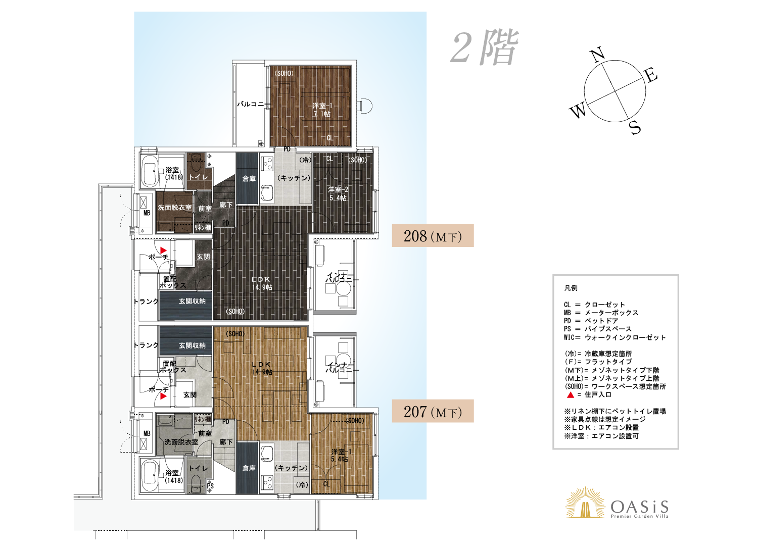 東棟の北側部分、1階〜4階のブロックです。1階は1層構造フラットタイプが2戸。2階と3階、3階と4階には2層構造メゾネットタイプがそれぞれ2戸ずつで構成されております。